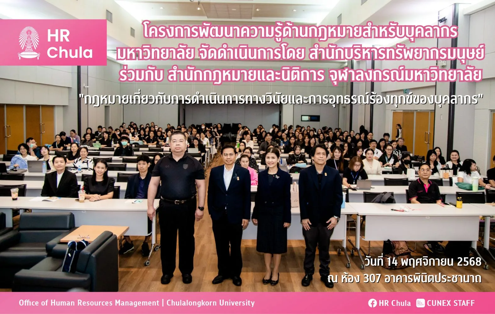 วันศุกร์ที่ 14 พฤศจิกายน 2568 จุฬาลงกรณ์มหาวิทยาลัย โดยสำนักบริหารทรัพยากรมนุษย์ ร่วมกับ สำนักกฎหมายและนิติการ จุฬาลงกรณ์มหาวิทยาลัย ได้ดำเนินการจัดโครงการพัฒนาความรู้ด้านกฎหมายสำหรับบุคลากรมหาวิทยาลัย โดยได้รับเกียรติจากรองอธิการบดี (ศาสตราจารย์ ดร.คณพล จันทน์หอม) เป็นประธานเปิดโครงการดังกล่าว ภายในงานมีการอบรมในหัวข้อ “กฎหมายเกี่ยวกับการดำเนินการทางวินัยและการอุทธรณ์ร้องทุกข์ของบุคลากร” ให้เกียรติบรรยายโดย รศ.ดร.มานิตย์ จุมปา คณะนิติศาสตร์ ตั้งแต่เวลา 9.00 – 12.00 น. ณ ห้อง 307 อาคารพินิตประชานาถ
