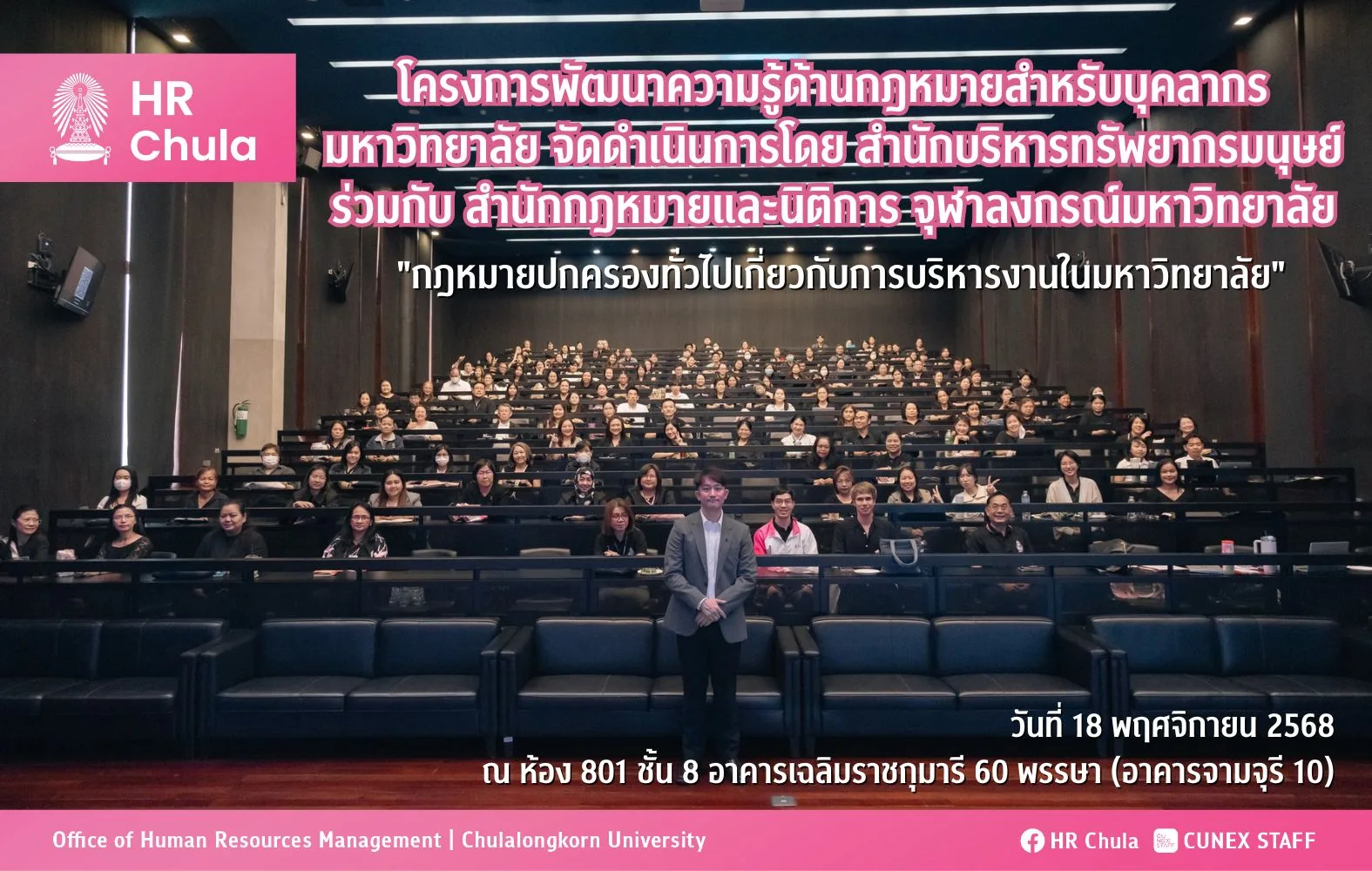 วันอังคารที่ 18 พฤศจิกายน 2568 จุฬาลงกรณ์มหาวิทยาลัย โดยสำนักบริหารทรัพยากรมนุษย์ ร่วมกับ สำนักกฎหมายและนิติการ จุฬาลงกรณ์มหาวิทยาลัย ได้ดำเนินการจัดโครงการพัฒนาความรู้ด้านกฎหมายสำหรับบุคลากรมหาวิทยาลัย โดยมีการอบรมในหัวข้อ “กฎหมายปกครองทั่วไปเกี่ยวกับการบริหารงานในมหาวิทยาลัย” ให้เกียรติบรรยายโดย ผศ.ดร.วรพล มาลสุขุม คณะนิติศาสตร์ ตั้งแต่เวลา 9.00 – 12.00 น. ณ ห้อง 801 ชั้น 8 อาคารเฉลิมราชกุมารี 60 พรรษา (อาคารจามจุรี 10)