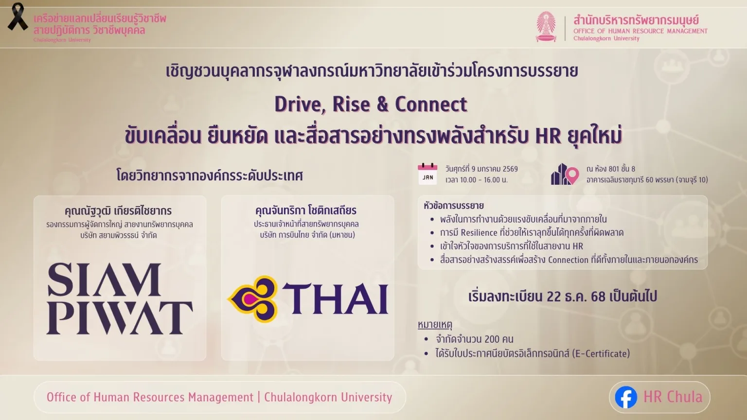 ฝ่ายการเรียนรู้และพัฒนาทรัพยากรมนุษย์ สำนักบริหารทรัพยากรมนุษย์ โดยคณะกรรมการเครือข่ายแลกเปลี่ยนเรียนรู้วิชาชีพ สายปฏิบัติการ วิชาชีพบุคคล เล็งเห็นความสำคัญของการเรียนรู้แนวคิด กลยุทธ์ และมุมมองใหม่ ๆ ในสายงานทรัพยากรมนุษย์จากองค์กรชั้นนำในภาคธุรกิจ จึงขอเชิญชวนผู้สนใจเข้าร่วมรับฟังโครงการบรรยายนี้เพื่อนำไปประยุกต์ใช้ในการปฏิบัติงานได้อย่างมีประสิทธิภาพและสอดคล้องกับการเปลี่ยนแปลง