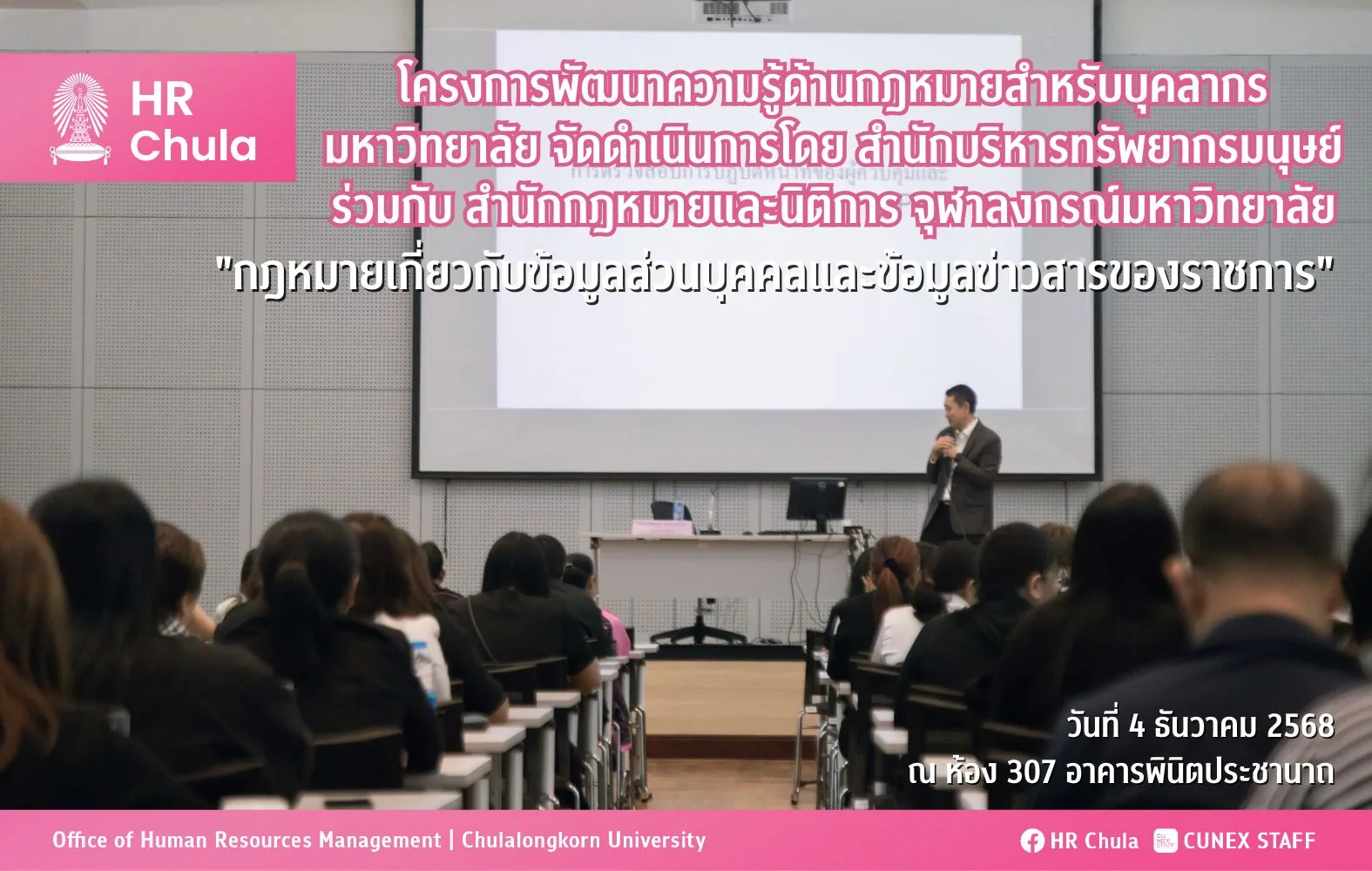 วันพฤหัสบดีที่ 4 ธันวาคม 2568 จุฬาลงกรณ์มหาวิทยาลัย โดยสำนักบริหารทรัพยากรมนุษย์ ร่วมกับ สำนักกฎหมายและนิติการ ได้ดำเนินการจัดโครงการพัฒนาความรู้ด้านกฎหมายสำหรับบุคลากรมหาวิทยาลัย โดยมีการอบรมในหัวข้อ “กฎหมายเกี่ยวกับข้อมูลส่วนบุคคลและข้อมูลข่าวสารของราชการ” ให้เกียรติบรรยายโดย รศ.ดร.ปิยะบุตร บุญอร่ามเรือง คณะนิติศาสตร์ ตั้งแต่เวลา 9.00 – 12.00 น. ณ ห้อง 307 อาคารพินิตประชานาถ
