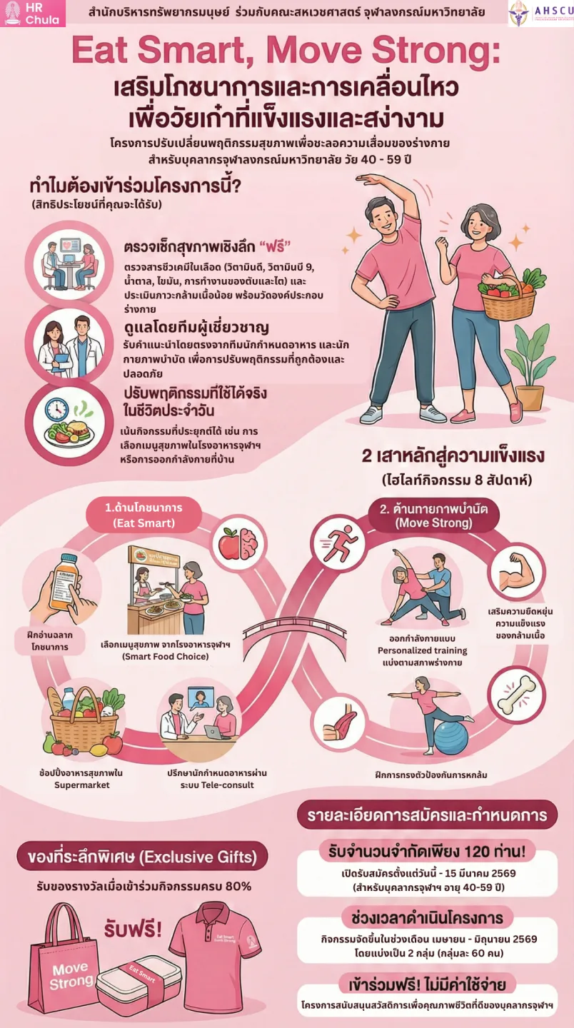 📢 ขอเชิญชวน ผู้บริหาร คณาจารย์ บุคลากร จุฬาฯ เข้าร่วมโครงการ 🥗Eat Smart, Move Strong 💪เสริมโภชนาการและการเคลื่อนไหวเพื่อชะลอความเสื่อม