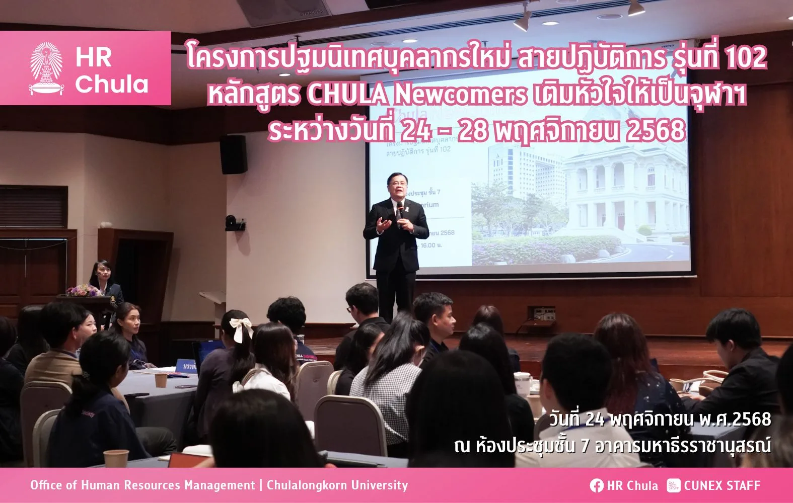 วันที่ 24 พฤศจิกายน พ.ศ. 2568 สำนักบริหารทรัพยากรมนุษย์ ได้จัดพิธีเปิดโครงการปฐมนิเทศบุคลากรใหม่ สายปฏิบัติการ รุ่นที่ 102 หลักสูตร CHULA Newcomers เติมหัวใจให้เป็นจุฬาฯ ณ ห้องประชุมชั้น 7 อาคารมหาธีรราชานุสรณ์ สำนักงานวิทยทรัพยากร (หอสมุดกลาง) โดยศาสตราจารย์ ดร.วิเลิศ ภูริวัชร อธิการบดีจุฬาลงกรณ์มหาวิทยาลัย ให้เกียรติเป็นประธานในพิธีเปิดโครงการและเป็นวิทยากรบรรยายในหัวข้อ “ทักษะแห่งอนาคตกับพลังแห่งความสำเร็จของมหาวิทยาลัย” โดยในงานมีการบรรยายในหัวข้อ “บทบาทของบุคลากรยุคใหม่” โดย ศาสตราจารย์ ดร.คณพล จันทน์หอม รองอธิการบดี, “แอปพลิเคชันเพื่อบุคลากรจุฬาฯ (CU NEX STAFF)” โดย คุณโภไคย ศรีรัตโนภาส ผู้ช่วยอธิการบดี, “โครงสร้างการบริหารมหาวิทยาลัยและกฎระเบียบที่เกี่ยวข้อง” โดย อาจารย์ ดร.จุฑาพร ชัยเดชสุริยะ ผู้ช่วยอธิการบดี, และ “ความก้าวหน้าทางวิชาชีพ & สวัสดิการและสิทธิประโยชน์” โดย คุณนุษรา ปานกรด ผู้อำนวยการสำนักบริหารทรัพยากรมนุษย์ สำหรับโครงการปฐมนิเทศบุคลากรใหม่ สายปฏิบัติการ รุ่นที่ 102 หลักสูตร CHULA Newcomers เติมหัวใจ
