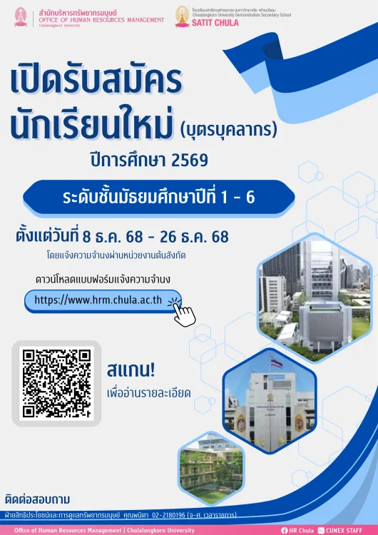 | 1.1.แนวปฏิบัติการรับนักเรียนเข้าศึกษาในโรงเรียนสาธิตจุฬาลงกรณ์มหาวิทยาลัย ระดับชั้นมัธยมศึกษาปีที่ 1 ปีการศึกษา 2569 | 56 | 08-12-2025 | DownloadPreview | |