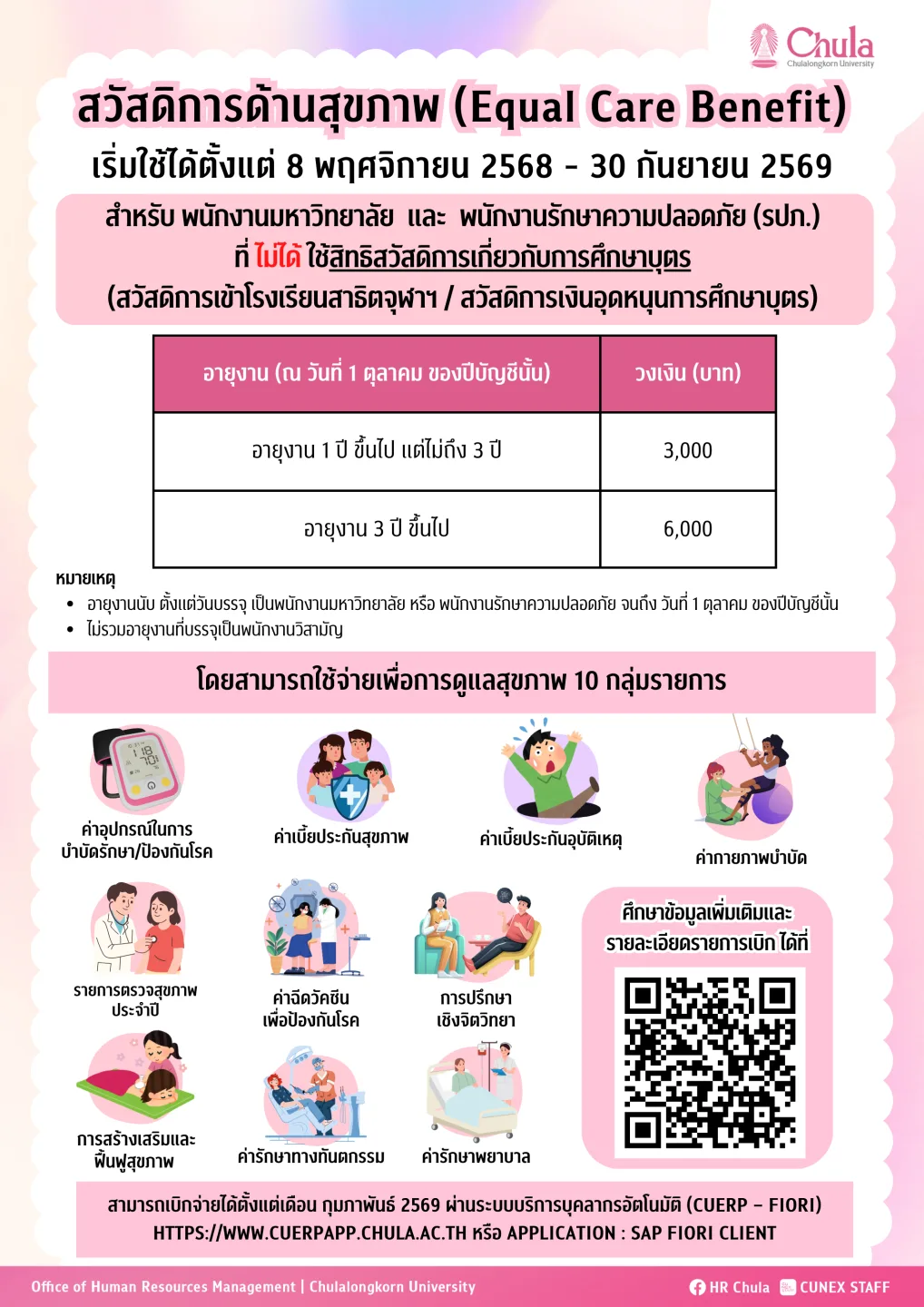 เบิกได้ตั้งแต่ เดือนกุมภาพันธ์ ถึง เดือนกันยายน 2569 ผ่าน ระบบบริการบุคลากรอัตโนมัติ (CUERP – Fiori)