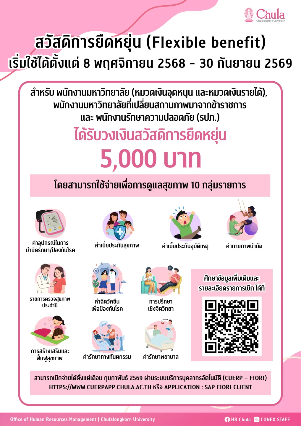 “สวัสดิการแบบยืดหยุ่นด้านสุขภาพ” คือ สวัสดิการด้านสุขภาพที่จุฬาลงกรณ์มหาวิทยาลัยกำหนดขึ้น เพื่อเปิดโอกาสให้พนักงานมหาวิทยาลัยสามารถเลือกใช้สวัสดิการได้อย่างเหมาะสมสอดคล้องกับความต้องการของตนเอง