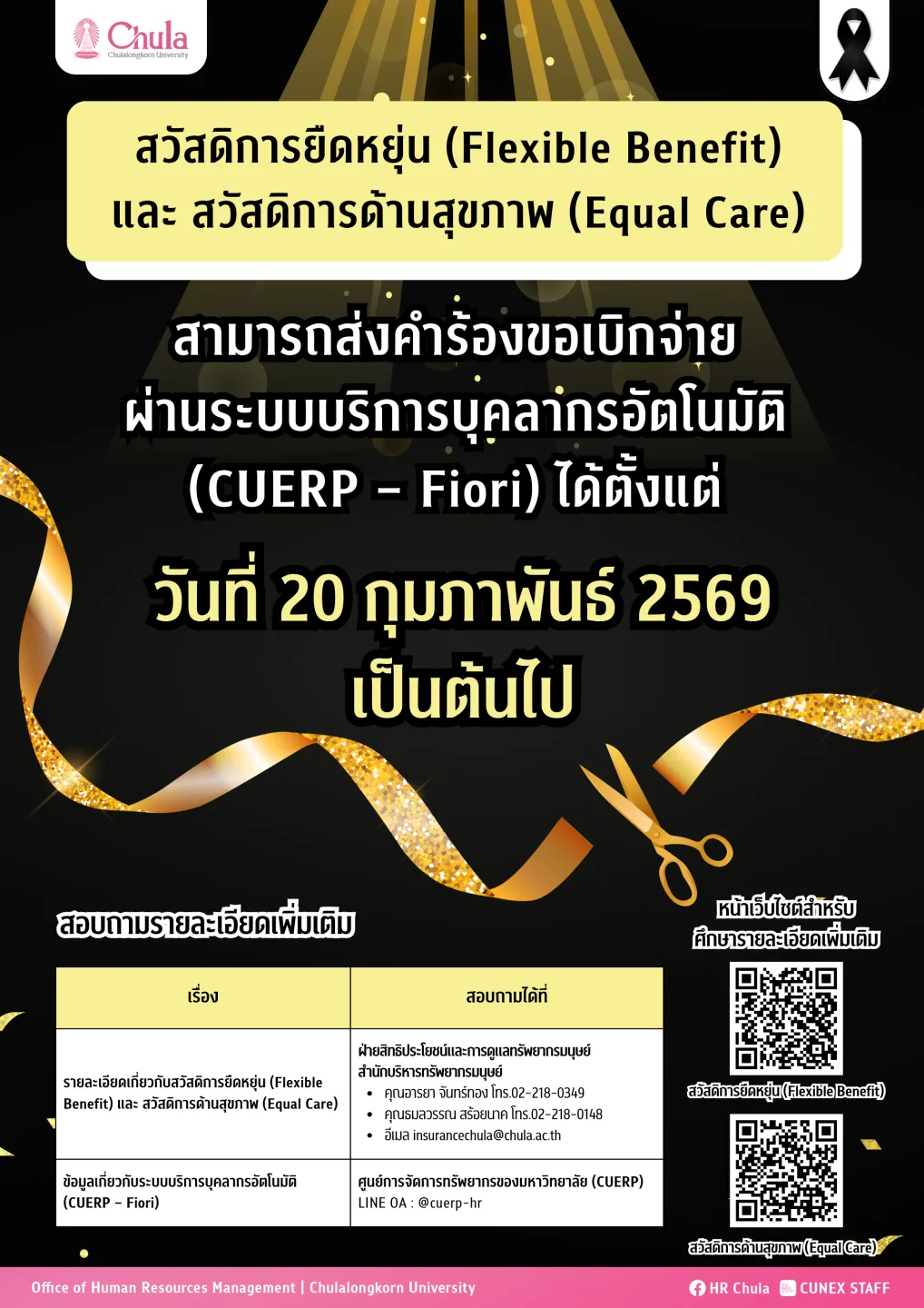 เบิกได้ตั้งแต่ วันที่ 20 กุมภาพันธ์ ถึง 30 กันยายน 2569 ผ่าน ระบบบริการบุคลากรอัตโนมัติ (CUERP – Fiori)