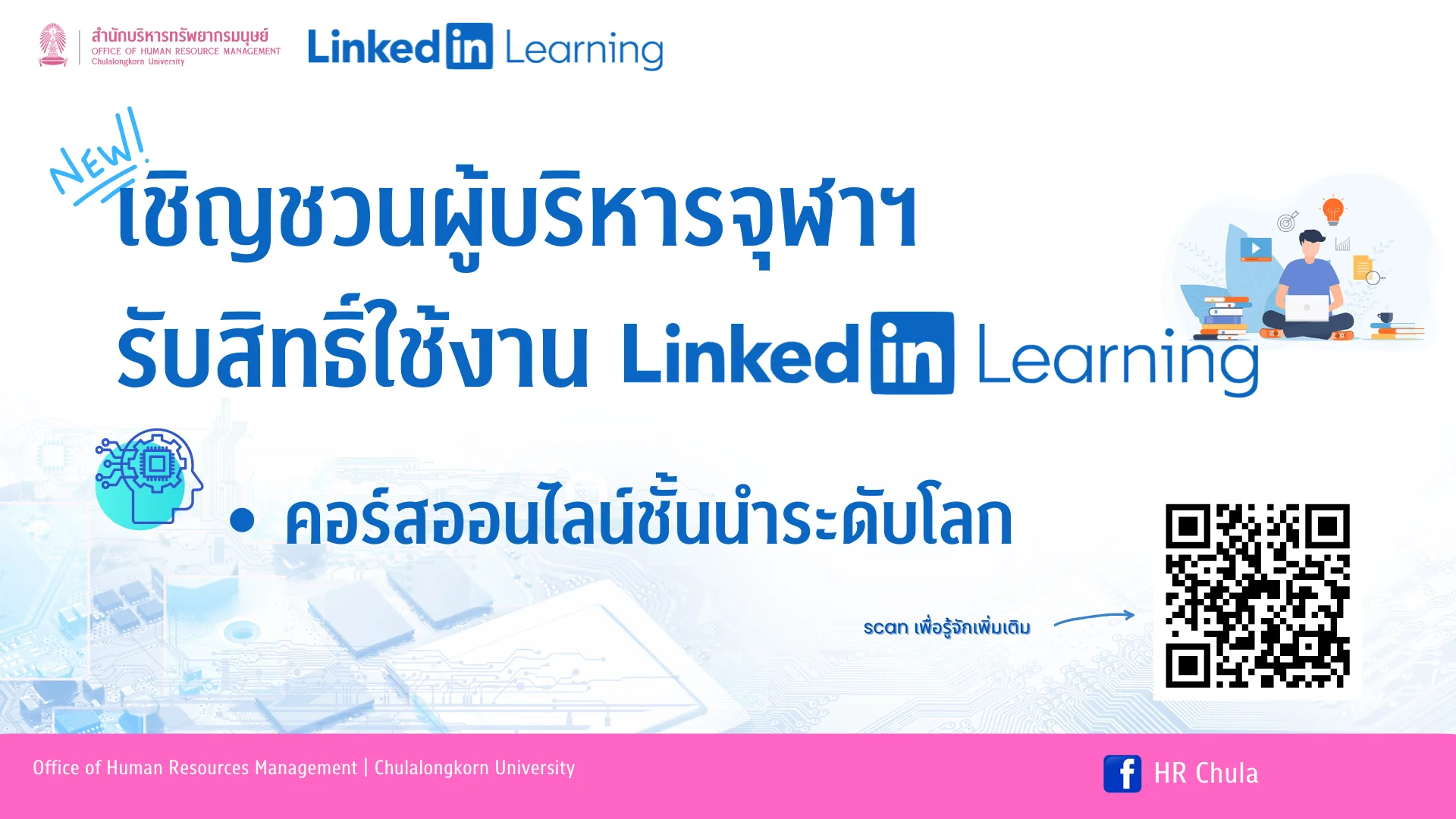 ขอเชิญชวนผู้บริหารจุฬาฯ รับสิทธิ์ใช้งาน LinkedIn Learning คอร์สออนไลน์จากวิทยากรชั้นนำทั่วโลก เรียนได้ทุกที่ทุกเวลา 2 เดือน มีระบบแนะนำคอร์สจากประวัติในบัญชี LinkedIn ของผู้เรียน เรียนจบได้ใบ Certification รับสิทธิ์เข้าเรียนบทเรียนออนไลน์จาก LinkedIn Learning ระยะเวลา 2 เดือน (เริ่มเรียนตั้งแต่วันที่