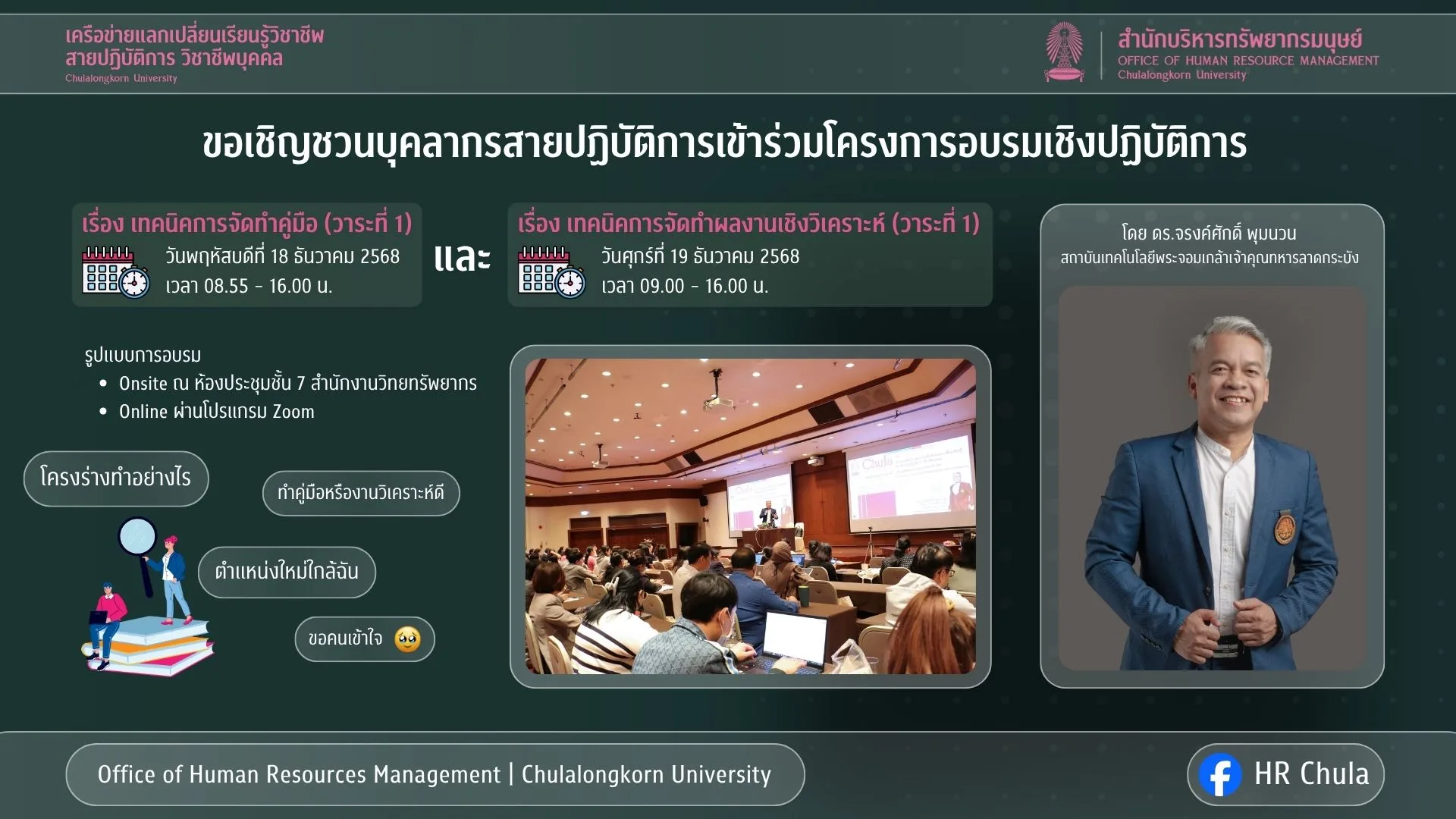 ฝ่ายการเรียนรู้และพัฒนาทรัพยากรมนุษย์ สำนักบริหารทรัพยากรมนุษย์ โดยคณะกรรมการเครือข่ายแลกเปลี่ยนเรียนรู้วิชาชีพ สายปฏิบัติการ วิชาชีพบุคคล เล็งเห็นความสำคัญของการจัดทำคู่มือและผลงานเชิงวิเคราะห์ จึงขอเชิญชวนเข้าร่วมการอบรมเชิงปฏิบัติการดังกล่าว เพื่อให้ได้รับความรู้และภาพรวมในการจัดทำ รวมถึงเพื่อใช้ประกอบการตัดสินใจในการเข้าร่วมโครงการในวาระที่ 2 ต่อไป วัน เวลา และสถานที่ วันที่ 18 และ 19 ธันวาคม 2568