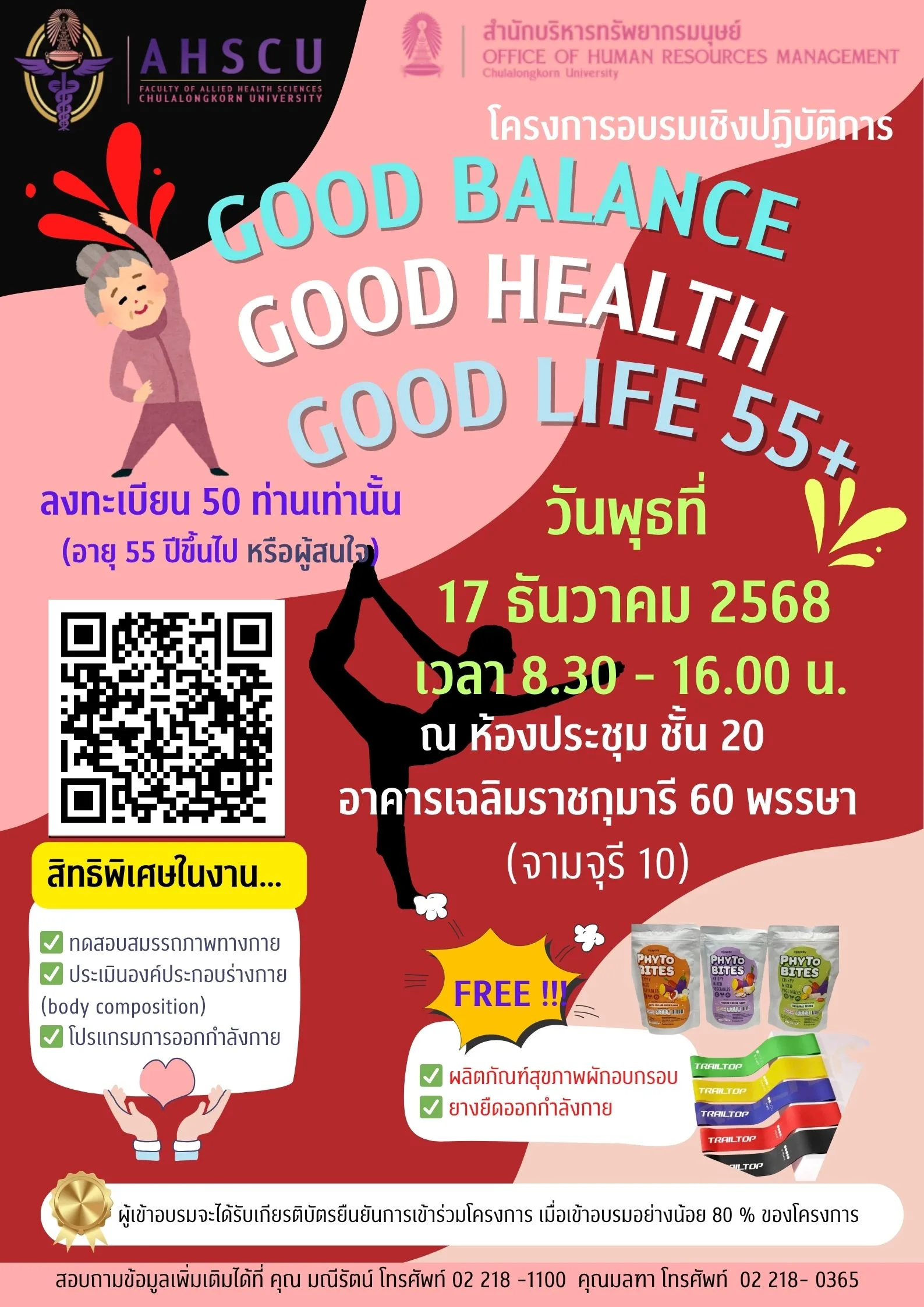 – ปิดรับสมัคร มีผู้ลงทะเบียนครบเต็มจำนวนแล้ว – ขอเชิญชวนบุคลากรของจุฬาฯ ที่มีอายุ 55 ปีขึ้นไปและผู้ที่สนใจ เข้าร่วมโครงการฝึกอบรมเชิงปฏิบัติการ เรื่อง Good Balance Good Health Good Life 55+โดยโครงการจัดในรูปแบบ กิจกรรมเชิงปฏิบัติการ (Workshop) และ