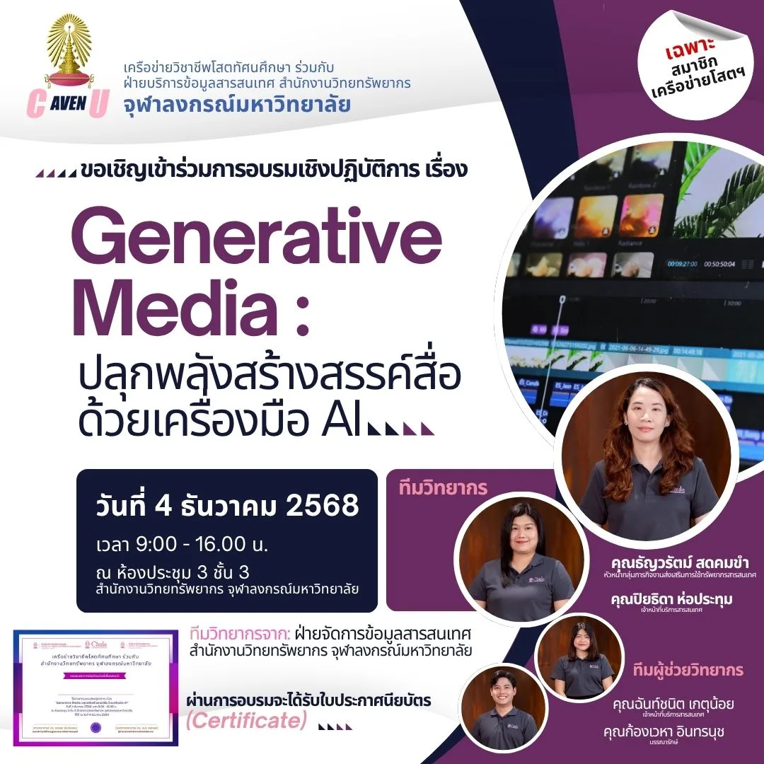 ขอเชิญชวน สมาชิกเครือข่ายโสตทัศนศึกษา ของจุฬาลงกรณ์มหาวิทยาลัย เข้าร่วม โครงการอบรมเชิงปฏิบัติการ เรื่อง “Generative Media: ปลุกพลังสร้างสรรค์สื่อ ด้วยเครื่องมือ AI” วันที่ 4 ธันวาคม 2568 เวลา 09.00 – 16.00 น.