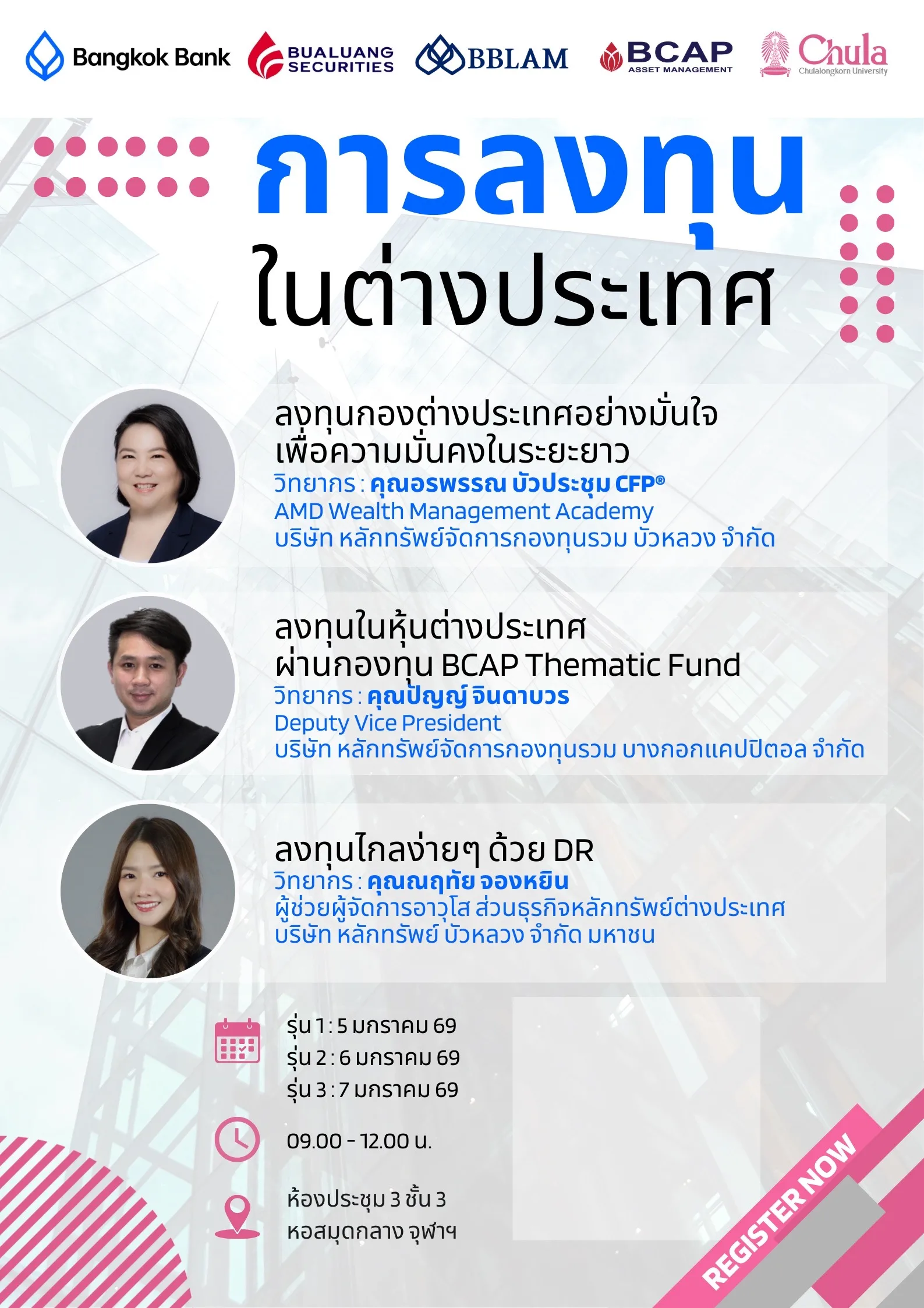 ขอเชิญชวนบุคลากรจุฬาลงกรณ์มหาวิทยาลัย เข้าร่วมโครงการอบรมโครงการ“การลงทุนในต่างประเทศ” ด้วยมหาวิทยาลัยและฝ่ายการเรียนรู้และพัฒนาทรัพยากรมนุษย์ สำนักบริหารทรัพยากรมนุษย์ ได้ตระหนักถึงความสำคัญการตัดสินใจลงทุนในต่างประเทศจำเป็นต้องอาศัยความรู้เฉพาะด้าน ทั้งในเรื่องกฎหมาย กฎระเบียบด้านการค้า การเงิน การบริหารความเสี่ยง ความเข้าใจด้านวัฒนธรรม และการประเมินศักยภาพของตลาดเป้าหมาย หากบุคลากรขาดความรู้ความเข้าใจที่ถูกต้อง อาจนำไปสู่ความเสี่ยงและผลกระทบต่อองค์กรได้ จุฬาลงกรณ์มหาวิทยาลัยจึงได้จัดดำเนินการร่วมกับธนาคารกรุงเทพจัดอบรมให้ความรู้ใน โครงการ“การลงทุนในต่างประเทศ” โดยแบ่งออกเป็นจำนวน 3 รุ่น โดยรับผู้เขาร่วมจำนวนรุ่นละ 50