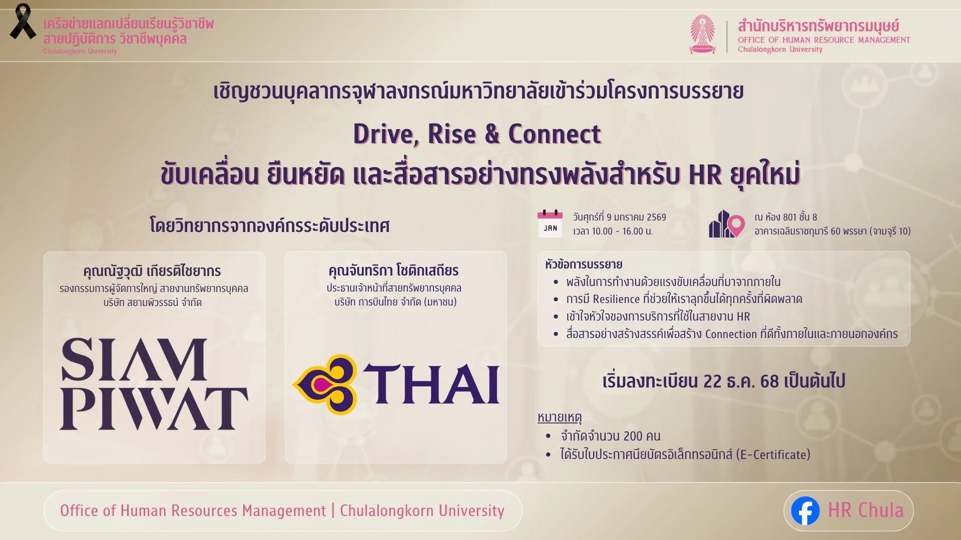 ฝ่ายการเรียนรู้และพัฒนาทรัพยากรมนุษย์ สำนักบริหารทรัพยากรมนุษย์ โดยคณะกรรมการเครือข่ายแลกเปลี่ยนเรียนรู้วิชาชีพ สายปฏิบัติการ วิชาชีพบุคคล เล็งเห็นความสำคัญของการเรียนรู้แนวคิด กลยุทธ์ และมุมมองใหม่ ๆ ในสายงานทรัพยากรมนุษย์จากองค์กรชั้นนำในภาคธุรกิจ จึงขอเชิญชวนผู้สนใจเข้าร่วมรับฟังโครงการบรรยายนี้เพื่อนำไปประยุกต์ใช้ในการปฏิบัติงานได้อย่างมีประสิทธิภาพและสอดคล้องกับการเปลี่ยนแปลง วัน เวลา และสถานที่ วันศุกร์ที่ 9 มกราคม 2569 เวลา