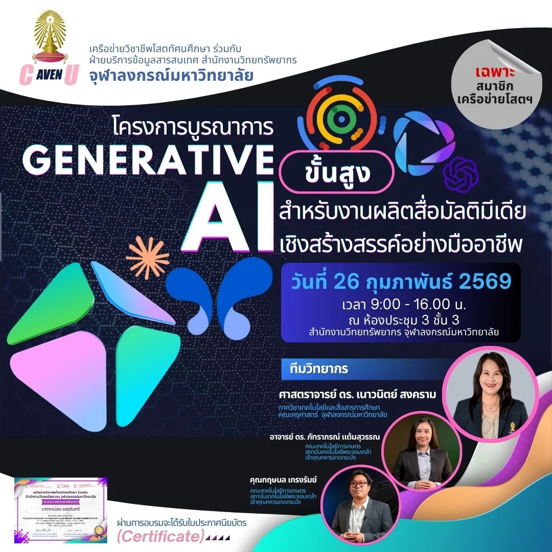 ขอเชิญชวน สมาชิกเครือข่ายการเรียนรู้วิชาชีพฯ โสตทัศนศึกษา เข้าร่วมโครงการบูรณาการ Generative AI ขั้นสูง สำหรับงานผลิตสื่อมัลติมีเดียเชิงสร้างสรรค์อย่างมืออาชีพ เพื่อมุ่งเน้นการพัฒนาทักษะเชิงลึกผ่านการลงมือปฏิบัติจริง เปิดโอกาสให้ผู้เข้าอบรมได้ทดลองใช้เครื่องมือ Generative AI ขั้นสูงที่กำลังเป็นที่นิยมในปัจจุบัน ทั้งด้านการสร้างวิดีโอ เสียง และสื่อภาพเคลื่อนไหว พร้อมทั้งเรียนรู้การออกแบบกระบวนการทำงานร่วมกับ AI อย่างเป็นระบบและมีประสิทธิภาพ วันและเวลาในการจัดกิจกรรม