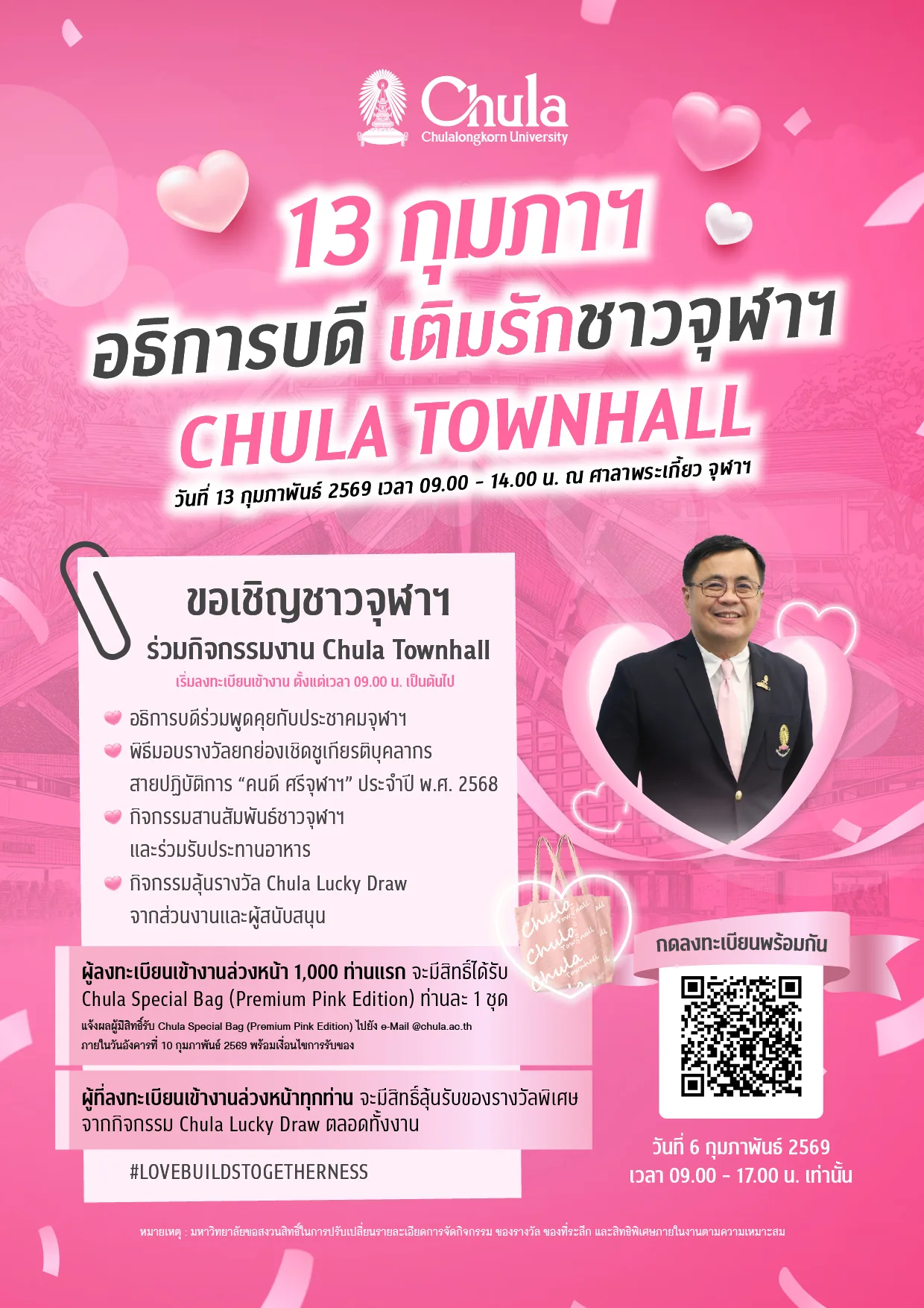 ยังไม่เปิดลงทะเบียน งาน Chula Townhall อธิการบดีพบรักชาวจุฬาฯ วันที่: 13 กุมภาพันธ์ 2569 เวลา: 09.00 – 14.00 น. สถานที่: ศาลาพระเกี้ยว จุฬาลงกรณ์มหาวิทยาลัย กิจกรรมภายในงาน: เริ่มลงทะเบียนเข้างาน ตั้งแต่เวลา