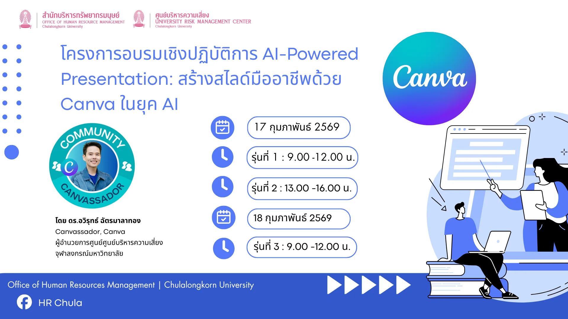 ขอเชิญชวนบุคลากรจุฬาฯ เข้าร่วมโครงการอบรมเชิงปฏิบัติการ AI-Powered Presentation: สร้างสไลด์มืออาชีพด้วย Canva ในยุค AI จุฬาลงกรณ์มหาวิทยาลัย โดยฝ่ายการเรียนรู้และพัฒนาทรัพยากรมนุษย์ สำนักบริหารทรัพยากรมนุษย์ ร่วมกับศูนย์บริหารความเสี่ยง ตระหนักถึงความสำคัญของการนำเทคโนโลยี AI มาใช้ในปฏิบัติงาน ควบคู่กับการจัดทำ Presentation ที่มีประสิทธิภาพ สอดคล้องกับบริบทการทำงานในยุคดิจิทัล จึงได้จัดโครงการอบรมเชิงปฏิบัติการ
