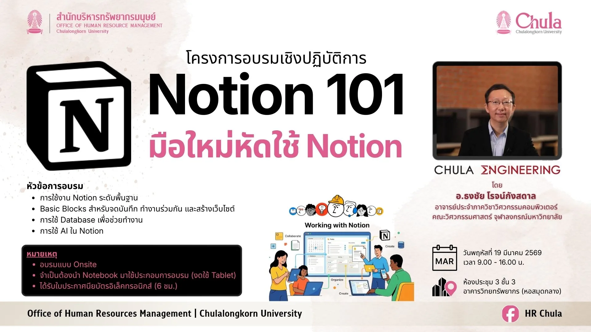 📢 เริ่มลงทะเบียนวันที่ 3 ก.พ. 69 เป็นต้นไป ฝ่ายการเรียนรู้และพัฒนาทรัพยากรมนุษย์ สำนักบริหารทรัพยากรมนุษย์ เล็งเห็นว่า Notion เป็นเครื่องมือหนึ่งที่ได้รับความนิยมในองค์กรและสถานศึกษา สามารถใช้งานได้ทั้งด้านการจัดการเอกสาร การวางแผนโครงการ การทำงานร่วมกันเป็นทีม และการจัดเก็บองค์ความรู้ (Knowledge Management) อย่างเป็นระบบ จึงได้จัดโครงการอบรมเชิงปฏิบัติการ Notion